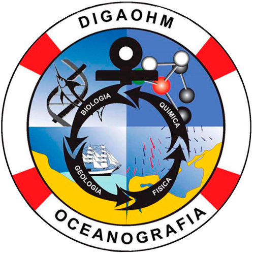 En posición de en Centro" sobresale un ancla formada por cuatro flechas en semicírculo, que hacen el vínculo de las cuatro áreas de estudio de la oceanografía visualizándose el nombre de cada una de ellas las cuales se mencionan siguiendoel sentido en que rotan las flechas: Biología, Geología, Física y Química escritas en letras color blanco mismas que corresponden a las figuras representativas que se encuentran en el primer plano.